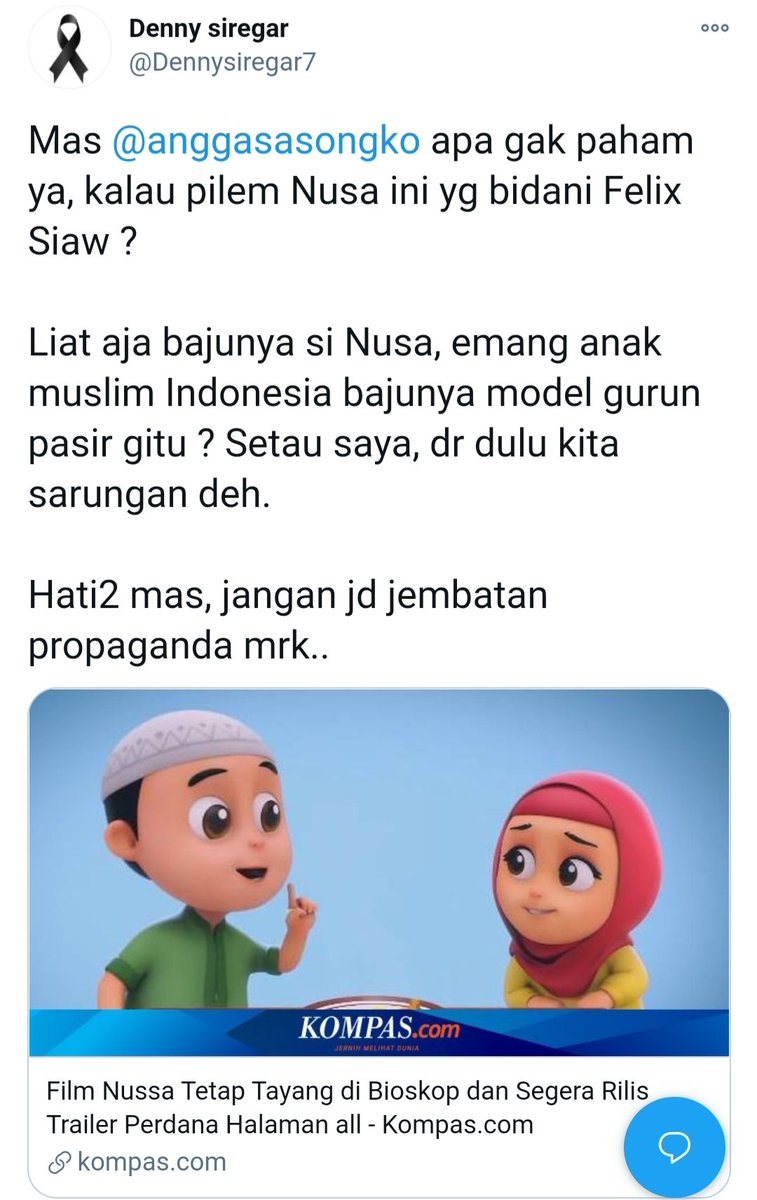 Busana Karakter Animasi Nussa Dikritik Denny Siregar Angga Sasongko Buka Suara Kalo Kaus Partai Gak Nyerap Keringet from asset-a.grid.id Denny siregar melalui akun twitter telah meminta penjelasan kepada telkomsel terkait kebocoran data pribadinya. Pos tentang denny siregar yang ditulis oleh rafa dan ameera. Denny siregar menuduh nussa, film animasi anak indonesia sebagai film propaganda. Sementara itu denny siregar lewat akun facebook mengapresiasi kinerja polri. Penyebar data denny siregar berinisial fph (27) adalah pegawai outsourcing grapari telkomsel rungkut, surabaya. Namun dalam cuitannya, denny siregar ikut menyentil soal ayam. Setau saya, dari dulu kita sarungan deh, jelasnya. Sebelumnya, denny siregar menilai trailer film nussa yang dibidani angga sasongko jauh dari gambaran umat islam di indonesia.